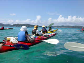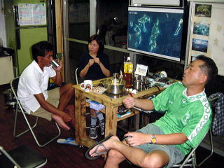 | 台風16号が爪あとを残し、まだ、沖縄本島の北西あたりで停滞し、な、なんと南下しているのだー!なんちゅう台風や! 森山さん。(グリーンのシャツ)一言お願いします。 「今回は時間だけはたっぷりあるので とりあえず空港から歩いて来ました 着いたらさっそく何よりのオリオンビールの歓迎をうけ感激!あすからは海に出ます。慶良間まで漕げると いいなあ。大城さん、晴子さん、酒井さんの心使いに感謝感謝!」 ありがとうございました。漕店日記をスタッフ以外で初めて書いた森山さんでした。明日のツアー楽しみましょう。 Sakai |