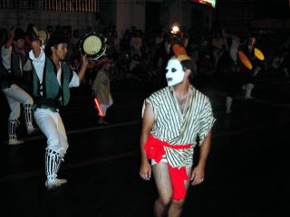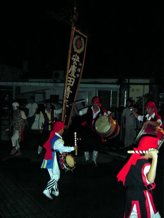 | 昨日の夜、いや、ちゃんと書くと今日の夜、0:00過ぎから03:00近くまで中部にある沖縄市コザでエイサーを見てきました。正直、驚いた!!!複数の青年団の方が町を練り歩きながらサンシンのリズムに合わせ勇猛に太鼓を鳴らす姿を見て涙が自然に込み上げてくるような感動を受けました。僕らが一緒に練り歩いたエイサー隊に6歳の男の子が先頭で、大人たちに負けじと小さい身体を大きく動かし踊っていました。身体は大人が持っている太鼓に入ってしまいそうな子なのに、カッコイイ!かわいいというよりカッコイイ・勇ましいという表現がぴったり。 どこのエイサー隊にも、顔に白塗りしてカツラをかぶった酔っ払い役(ピエロ)が2〜3人いて、私が見た感じだと一つの隊をまとめているようでした。踊っているのは酔拳のようにあっちこっちでフラフラしているように見え、笑いを取るため、おもしろいことをしているのですが、とっても気配りが行き届く人間でした。疲れてきた隊員の近くにより、元気を出させたり、衣装の修正やうちわで子供をあおいました。 同じアパートに住んでいても住人を知らないような世の中で、エイサーには地域の子供たちと大人が接する事ができ、地域に深く溶け込み、私みたくあっちこっちを転々としている者にとっては、とても羨ましい、だから、感動したと思う。大人から学んだ事を次の代へ次の代へと引き継がれて踊っているエイサーには歴史と誇りがバックに見えました。 これは、一見の価値あり!俺もエイサーやってみたい。 sakai ![]() 勇猛な子供達 この方の踊りは芸術に近い! |