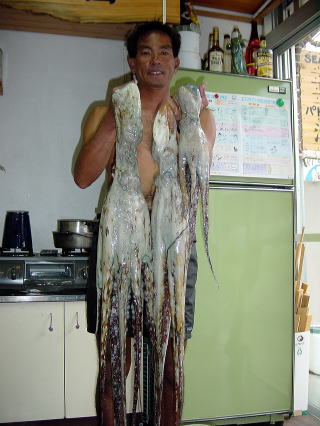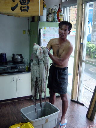 | 9月1日(土) 旧暦7月14日 雨 なかび 今日のタコの天敵大城さんの収穫!これでも小さいと愚痴をこぼしている。このタコはお中元になるそうです。 |