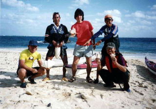日帰りツアーで南部をかじってきました。志喜屋から久高島に行きたかったのですが、あいにく北風が強く、島影に隠れながら、西側の奥武島へ。 東郷さんツアーの感想書いてよ!(プリーズ) と、いうことで日記乱入第2号だす。(1号のヒデモリさん元気?) 神の島久高へいざ行かん、邪念はいかんと緊張していたら風で反対の奥武島に変更に。風裏、リーフの中ときて波もなく邪念だらけのだらだらツーリング。陽射しも優しくこういうのもいいもんだなあ。 上がった帰りに浜辺の茶屋(宮本亜門邸のとなり、海の眺め最高!)でお茶を一服、このゆるゆるコースおすすめでっせ。 ありがとうございました。いやいやこれを書いていただいてる間にブロック崩し(パソコンのゲーム)に夢中になってしまった。もちろん東郷さんのパワーブックG4でね。 ksakai |