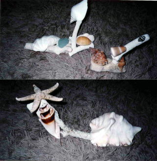 | 貝のオブジェ。貝売りまっせ! | 左からワッキーさん、酒井、藤哲さん。 | |
