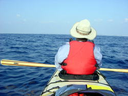 フゥ〜。やっと前島のちょうど南側に辿り着いたところです。 この後、フェリーが追いついてきました。 フェリーの引き波はデカイ! |