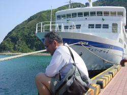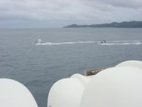 | これまでに見たことがない盛大なお別れでした。転勤する人、高校に入学する人、 社会人になる人、東北から来た小学生たち、様々な人たちを乗せフェリー座間味は出港しました。16:00にいつもだったら「ボー!」っとなるのに、今回は「ほたるの光」が流れ、見送る人は太鼓を叩き、三味線で踊り、いつまでもいつまでも手を振っていました。関係ない僕らもウルウル(涙)きて島の人のあたたかさを改めて実感しました。グスク島を越えたあたりから、ジェットが2台フェリーを追いかけてきました。そのジェットには国立沖縄青年の家の旗と渡嘉敷村の旗をなびかせながら疾走!わざわざ渡嘉久ビーチの青年の家海洋研修場からギシップを通って来たらしい、なんて粋な計らい!彼らは最後に海上で180度ターンを見せ、帰っていきました。海の男の友情(団結)には胸が熱くなり感動しました。 |