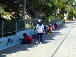 津堅島の小学生が学校の壁に思い出の絵を書いていました。 ここにいるのが全校生徒だそうです。 |