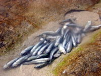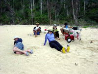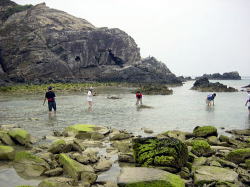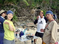 | はなれ島の中腹で! | みんなでイワシを捕獲! 30匹くらい手づかみで捕まえ、 各自のおなかの中に収まりました。 |