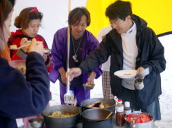 | 七輪で焼肉だって!うまそー! 奥平さんのおにぎりと筑前煮が大人気! |