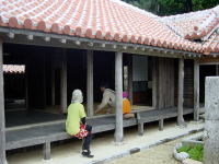 | アグネスチャン(?)の浜でくつろぐ。夜はタマンがヒット!ついでに朝は6キロクラスのガーラと巨大カマスを釣り上げ、このカマスの胃袋には5センチ弱の釣針があり、外に飛び出していたそうです。いたそー! | ゲルマ島の高良(タカラ)さん家にお邪魔しました。ここは座間味村の重要文化財の家で素晴らしい家でした。高良さん(104歳)は那覇で生きているそうです。 |