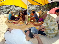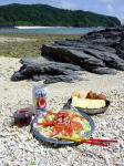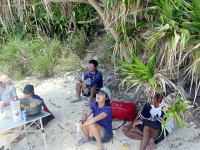| 朝食 | 阿嘉島のビーチの沖。 | お昼はゆっくり、 アダンの下でひと休み。 |