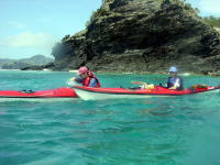| 昨夜の大雨で滝が復活!今年初の滝が見れました。 | 沢村さんの自艇紅いカフナ。 カフナも7日目にして、慶良間の海に浮かぶ。喜んでるはずですよ。 俺もカフナが欲しい〜! |