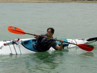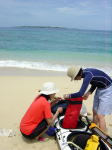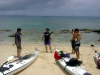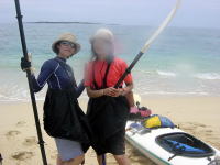 | 滝でシャワー色気は無いけど見てても気持ち良い。 | 儀志布島からハテ島へ 漕ぐ前に装備の点検 |