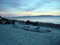 渡嘉敷島へ沈む夕日 | バックの慶良間から漕いで来て 瀬長島でゴールの乾杯! |