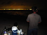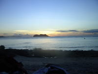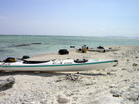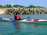 | ■チービシ1泊2日ツアー■ 瀬長からチービシへ向かうものの、空港横のバラスで、 海の状況が良くないので、断念を決意。 せっかくなので、外洋まで出てみようかとなり、うねりの中、漕ぎ進む。 「う〜ん、行けそうな気が・・・・」「吉田さん大嶺さん体力あります?」 お二人の陽気で頑張る気持ちがあったので、お〜し!頑張って行ってみよう!!! 向かい風の中、ようやく神山島にたどり着く。そこは、楽園。 島影に入ると、風もうねりも小さくなり、 ダイビング船もたくさんいた。 やはり、シーカヤックで行くと、「お前らは船で来たんか?」 僕らは自力で漕いできた(えっへん)と自己満足に陥ってしまう。 沖縄本島の夜景を見つつ、お酒を楽しむ。 運が良いことに、2ヶ所の花火を1日で見てしまった。 帰りは、北風とうねりに押されあっという間に 那覇に着いてしまう。 吉田さん、大嶺さんまた遊びに来てね。 教訓:テントは良い物を買いましょう。 k.sakai |