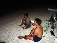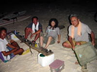 | リーフの上で昼食 | 事務所に戻り、泡盛で打ち上げ。 | 安慶田青年団のエイサー |