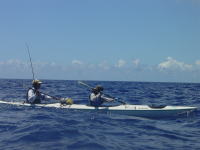 | ■8/25ウリズンカヤック?!ツアー■ 志喜屋〜久高島までのツーリング。 風もなく、波もなく、緊張感0(ゼロ)のパドリング。 帰りに、5キロクラスのオオマチを大城さんがあげる。 みんなのお腹の中へ。 |