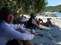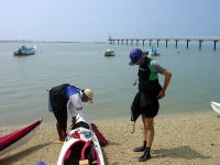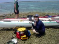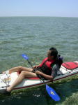 初カヤックの湧川さん。 | サンドイッチの昼食。この時のオレンジシャーベットが美味いのなんのって最高だよ! |