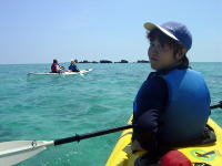 | 『7月30日(火)に志喜屋からコマカ島へ。』 東風がだんだん強くなり、向かい風の中のパドリング。 さすがアルガフォレストでスクールを受けている 丸山さんはラダ−を使わずバリバリ漕いでいました。 行きは1時間10分、帰りは海上で休憩したのにも関わらず45分で着いてしまった。 風の影響は凄いね♪ 帰りに奥武島の天ぷらを買いに行ったが、運悪く定休日でした。悔しい〜! 悔しいからアイスを食べました。美味かった〜♪ k.sakai |