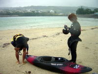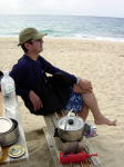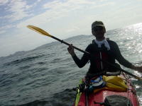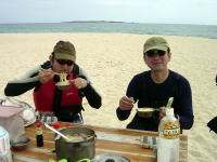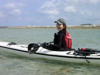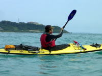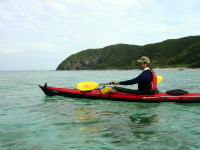 | ■ポカポカ陽気、気分も陽気やっと沖縄らしいツアー■ 2/9(日) 志喜屋漁港からコマカ島へ。今日は東風で行きがけは少し向かい風でした。 陽が出るとポカポカして春のような感じです。 ビーチでゆんたくして、斎藤さんはひたすら海に潜ってました。 せっかくルアーを引っ張って漕いでいたのに、 何のあたりも無く、丸坊主!!!(無念) |