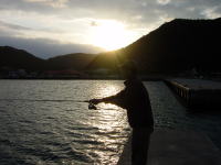 | 初日、海が荒れて出航できず、 渡嘉敷港の防波堤で釣竿をたらす。 |