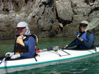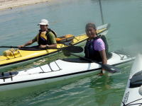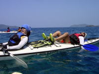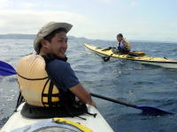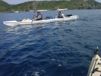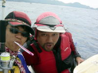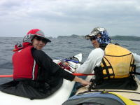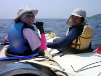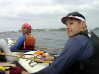 途中合流の須田さん&田中さん フェリーが入港する時に、 「須田さんたち僕ら(カヤック) 見えるかな〜?」 と話していて、 合流後聞いてみると、 爆睡してたらしい(涙) |