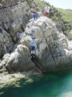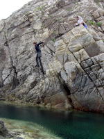 飛び込んでるのは、岡野さん 2回目は女性で初の頭から 飛び込んでしまう。負けじと 目黒さん(赤パンツ)がバックテンで 飛び込む!恐るべし! テンション上がりまくる! 写真の青シャツが棟梁! 今回のツアーのキャラクター賞 ここから飛び込むのに30分はかかる |