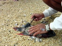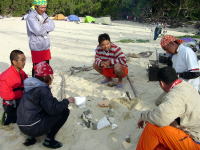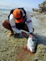 さっきまで海で泳いでいたのに、 コマカ島で解体される。 胃袋には20cmくらいの 小魚が入っていた。 |