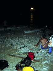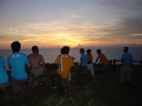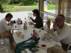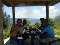 比嘉さんコンビ | 久高島から知念半島を見ながら 昼食。暗くてよく映ってないですね・・・ |