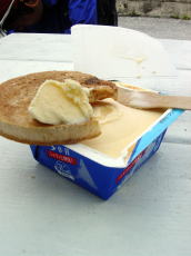 | 塩せんべいと バニラアイスクリームが よく合うんだな♪ |