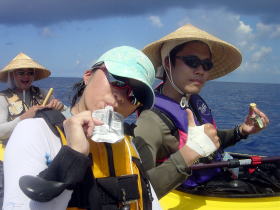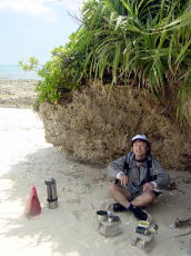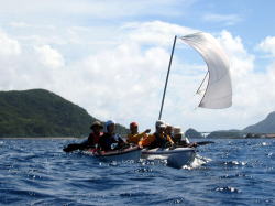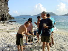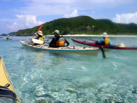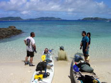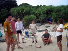 | 久高島を出発 | 途中のコマカ島に上陸し 休憩する。とにかく海に入ると気持ちが いいのである。 アジサシの集中攻撃をあびる。 |