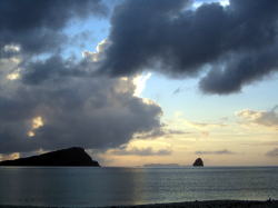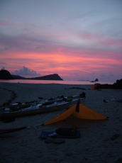 | ■大雨洪水雷注意報〜!こわ〜!■ 7/9(金),10(土),11(日) 初日、渡嘉志久ビーチを出発しようとすると、南から雨雲が立ちこめ大雨が降り 視界30m程になるが、10分も降ると晴れ間が出てきた。 これが今晩の嵐の前兆とは・・・・ 儀志布でキャンプ、夕食をほとんど済ませた後に、雨が降り出す。 「雨だ!!!」 「フライのカバー閉めて!!!」 雨は徐々に強くなり、雷が鳴り出し風も強くなる。 ”ピカーっ” ”ゴロゴロ” 防風の中、漕店の黄色いタープがワッサワッサゆれ始め 皆でタープが飛ばないよう押さえる。 この時の写真がないのが悔やまれる。 ”ピカーっ” ”ゴロゴロ” 海上に落雷が見える!ひえ〜このタープに落ちないで〜 ”ピカーっ” ”ゴロゴロ” ”ドカーン” 凄まじい落雷の音が耳に、胸に伝わり怖かった〜♪ 一瞬雨が止んだ隙に、皆テントに逃げ込む! あ〜こんな時に俺はタープだ!!! ひえ〜!!!!! タープ内に雨が入り込むので、 雨具を着てなんとか寝るが、稲光と大雨で寝れやしない。 こんなに夜が長いのは久しぶりでした(笑) あれを乗り越えると、よっぽどじゃないかぎり驚かないね(笑) 後で聞いたが、とてつもない大きな落雷の音は やはり青年の家の本館に落ちて 電話が不通になってたらしい・・・ |