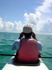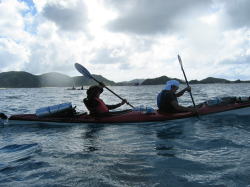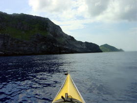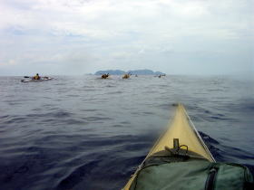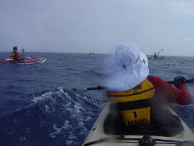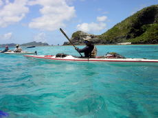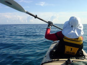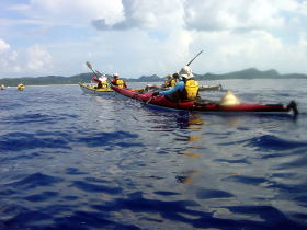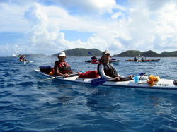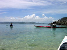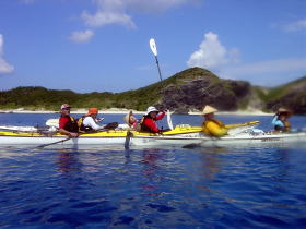 | ■7/15日帰りツアー■ 台風9号が午前9時に発生しました。 台風の影響か、コマカ島から久高島の間に大きな心地良いウネリが南から 押し寄せていました。パドリングには全く支障なし。 志喜屋漁港を出発し、沖合いにカヤックが4艇! コマカ島を横目に久高島へと目指す、コマカにもカヤックが2艇!!! う〜ん、沖縄もカヤッカ-が増えてきたのかな!平日なのに?!?! |