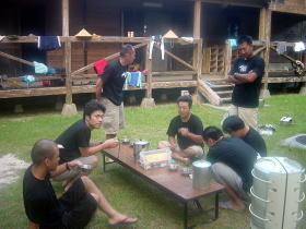 | 今回は恐ろしい程、みな9時頃には就寝し、 恐ろしい程早く6時には起きてきて、 すべと行動が早く進んでとても楽でした。 安室島を8:30に出発したのは、凄い! いつもはだいたい10:00ごろ出発が基準ですからね。 時間を見て、まだ午前中だと なんだか得をした気分です♪ 早起きは三文の得。 |