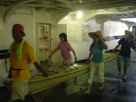 急遽参加した細川さん! 写真を見ておわかりかな? 私バウに乗ってます。 体重差が大きく、空荷で私が後ろだと バウ海に突っ込んでいました♪ ヤッホーバウだ!バウだ!イェ〜I |
