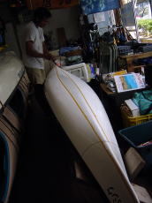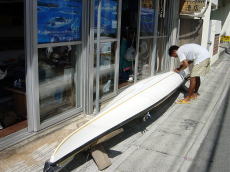 | 暑中お見舞い申し上げます! 7月も今日で最後となりました。 なんだか夏のピークが過ぎこれから段々涼しくなっていくと思うと寂しい気分ですね。 まだまだ暑い中、 昨日と今日とカヤックのゲルコートを塗っています。 船底が磨り減りゲルコートが薄くなって、中のファイバーが見え隠れしていました。 おかげで事務所はいい匂い?でちょっとトランス状態です♪ ツアーがない日はこんな地道な仕事をやってるんです♪ |