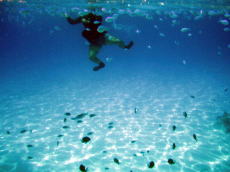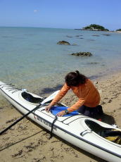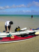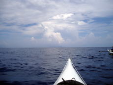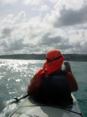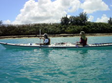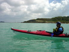 | ダイビングした後に飛行機に乗ってはいけないそうで、 残った日の飛行機の時間までカヤックの講習に参加した河原さん。 ダイビングした日に飛行機に乗ると脳が危ないらしい♪ 天気が良く、東風が軽く吹きちょうど良いパドリング日和でした。 |