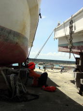 | 漁船の陰で休憩♪ 風が通りが良く気持ちが良い。 |