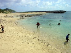 | 当初、14日に日帰りツアーを予定するが、 まだまだ海には台風13号の余波が残っていて ようやく15日に開催することができました。 恐るべし台風の威力! 志喜屋漁港は盆休みもあってあか、これまでにないような 賑わいでプチ湘南化とし車が止められない状態でした♪ ビーチでは”プ〜ン♪”とビールが飲みたくなってくるような BQの香ばしい匂いが周囲に立ち込めていた。 さてそんな中、志喜屋から東風を突き進み、久高島へ。 帰りは東風に乗って速いのなんのって黙ってても進んで楽チンでした。 ウサギが跳ね始めた海でコマカ島を越えたところで事件が! 2人でしゃべりしながら軽いタッチのパドリングをしていると、 おや?この辺波が立つな〜? お〜、少し浅いわけか〜なるほどね〜フムフム♪ 沖合いから北北西の進路をとっていたから右手側に東からのうねりが入ってきていた。 横波を注意しながら東側を向いていると、 おっ?おや〜?大きなうねりのが見える。 「木浪さん横波来るよ〜♪」と言葉をかけ、 ブレイクしてなかったからなんてことないと思っていたら、 その1つのウネリがブレイクしやがって、 スカートを外していたから海水が、ガっーーーって入り、 にゃロメこんちきしょうと右側へ体重をかけ久々の伝家の宝刀マジブレイス!!! ふう〜必殺技を出してしまった〜! |