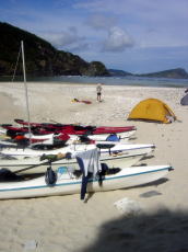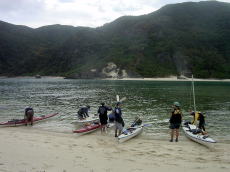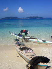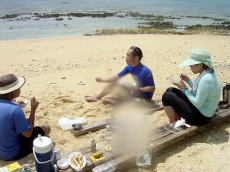 | 前島の北側の浜で途中休憩 | 右から、ちーさん、総長、酒井。 皆さんシーカヤックの時はサングラスをつけましょう!私は不覚にも忘れてしまい まぶしくて頭痛が・・・ |