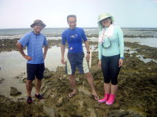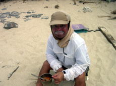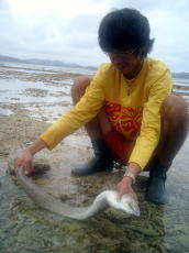 | 2日目午前中、ビーチコーミングに 出かけると巨大ウツボを発見! 小さいと見向きもしないが、大きいと 本能が騒ぎ捕まえてしまった。 食べようと浅瀬に放しておいたら、 昼寝の間に潮が満ちどこかへ 行ってしまった。せっかく人生初の ウツボが食べれると思ったのに〜♪ ぐやじい〜 |