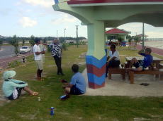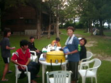 大城さんと合流し、 片付けを終わらせて、 ちょいとゆんたく。 カネモトさんが車を見たといって 駆けつけてくれて、ベンチで読書していた おじいも加わり、カヤックの話題で 盛り上がる。 |