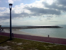 到着した糸満の塩崎にある 人工ビーチです。 とっても綺麗に整備されて、 外に水着で浴びるような無料の シャワーも完備しているのに、 「遊泳禁止」の 看板がある! う〜ん? なんか矛盾してる。 |