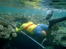 2日目午後、キャンプサイト前で シュノーケリング。 ポケットの中にはサザエが一つ〜♪ もう一つたたけばサザエが二つ〜♪ 大城のポケットからこれでもかと サザエが出てきた! |
