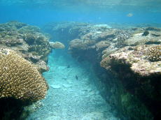 サンゴの切れ間が綺麗。 カヤックで海から上陸する時は、 ここを探します。 何故かって? この切れ間は波が立たないんだな。 |