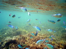 | 渡嘉志久ビーチの海 | 須田さんの手に魚肉ソーセージ の匂いがのこり、須田さんの周りには 小魚がたくさん群がっていました。 |