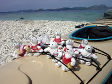 | 全員集合! コカコーラの景品か? オリンピック種目のシロクマのぬいぐるみが 浜辺に打ち寄せられていました。 オリンピックと白熊? コカコーラと白熊? う〜ん・・・ |