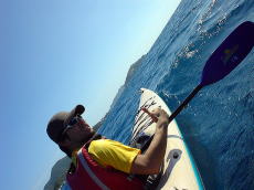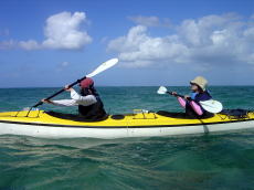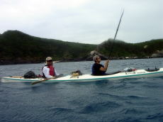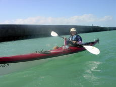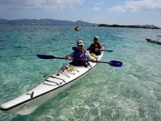 大川さん&まきこさんパドルで風を受けて 北名城ビーチまでひとって飛びでした。 |