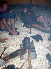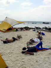 昼食後心地よい太陽の下で皆さん 昼寝。これがまた気持ちが良い! 昨晩の強風でタープのセンターポールが 折れてしまった・・・ |