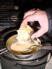 | 焚き火の下にジャガイモを入るサンド焼きを やってみました。 これをしょうゆからさんマヨネーズで 食べる、ホクホクして皮がパリパリで 美味しい。 |