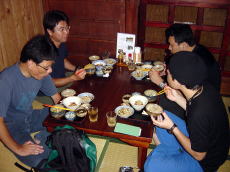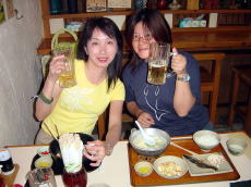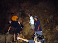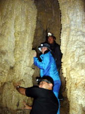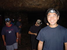 | ヘッドライトの明かりだけを頼りに、綺麗な鍾乳洞の隙間を通り奥へ進む。 | こうもり発見! | 夕食は「で〜びる」です。 なんだかツアーの打ち上げのようで 変な気分でした。 |