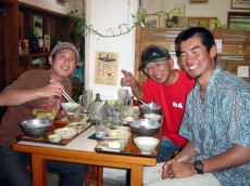 豆腐屋で飛行機の時間まで打ち上げ。 | 大垣さんの赤いTシャツの背面には 「泡盛」と・・・ カッコイイ〜? |