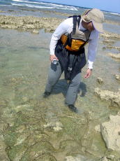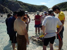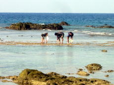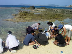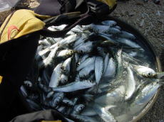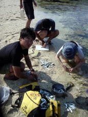 3日目の朝、 干上がったリーフの上になにやらキラキラした物が!よく見ると跳ねていて小さないわしの群れが落ちている?かな?リーフに打ち上げられていました。 |